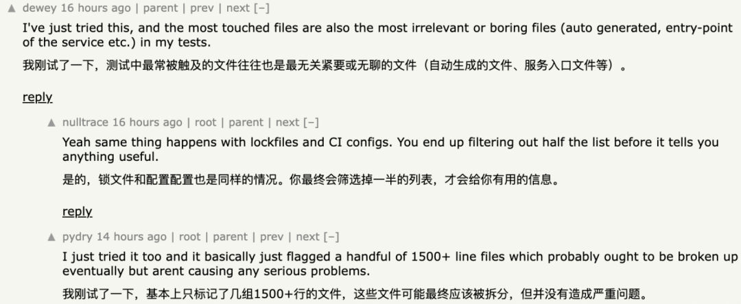 网友认为,在测试中接触最多的文件往往也是最无关紧要的文件,比如依赖文件(package.json)、lock file、CI 配置,以及一些自动生成文件等,这些文件会频繁改动,但并不代表复杂。