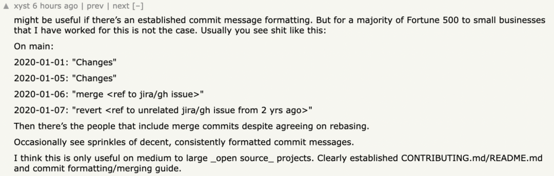 他表示,「如果团队有规范的提交信息,这些方法才有用。」但现实中,无论大公司还是中小企业,提交记录往往混乱,清一色的「Changes」、随意 merge、莫名 revert,还有一些人,明明团队约定用 rebase,却还是会提交 merge commit。