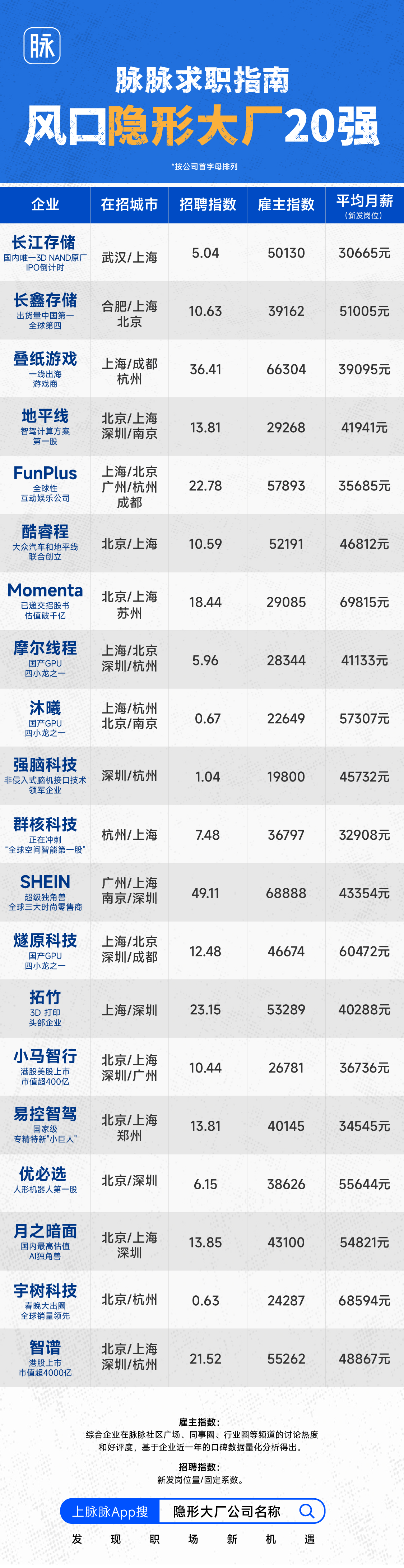 凤凰网科技讯 4月9日,昨日,职场社区平台脉脉发布80家“隐形大厂”名单,涵盖智谱、SHEIN、地平线、Momenta、月之暗面、摩尔线程、优必选、宇树科技等企业,涉及AI大模型、智能驾驶、机器人、芯片、跨境电商等赛道。此外,脉脉还从80家企业中进一步筛选出20家高速成长企业形成“隐形大厂20强”。
