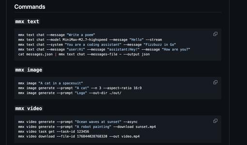 MMX-CLI提供全面的多模态能力,包括多回合文本对话和流媒体输出、可调整尺寸和批量生成的图像、支持异步处理和进度跟踪的视频生成、多语音文本转语音和流媒体播放、带歌词的音乐创作,以及图像理解和描述功能,帮助AI Agent高效完成创作和分析任务。