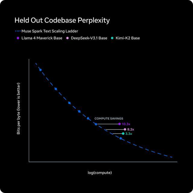 在技术方面,MSL大幅度提升了算力利用率,与之前的模型Llama 4 Maverick相比,Muse Spark用少一个数量级以上的计算资源就能达到相同的性能。