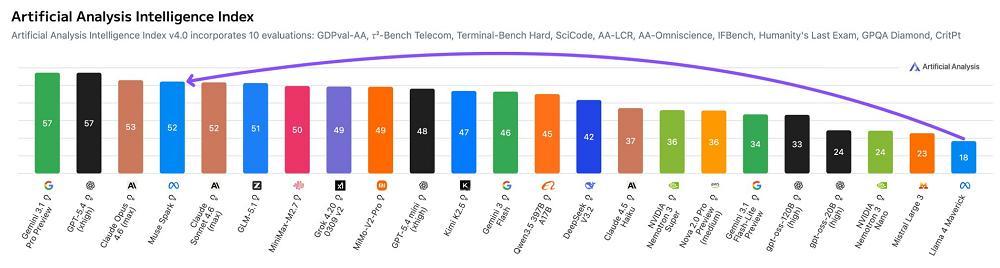 在大模型测评平台Artificial Analysis上,Muse Spark的智能指数直接从Llama 4 Maverick的18分,跳到了52分,介于Claude Sonnet 4.6和Claude Opus 4.6之间,算是进入第一梯队了。