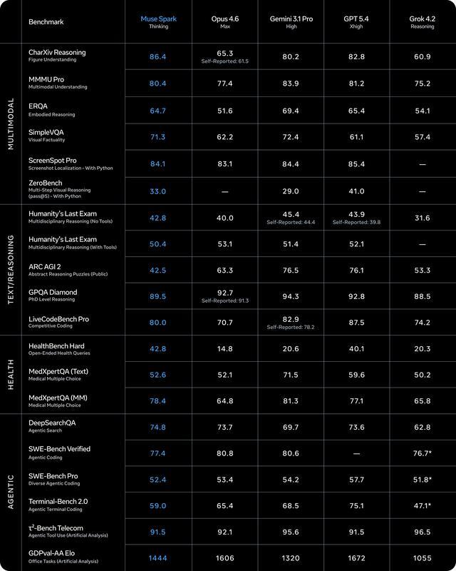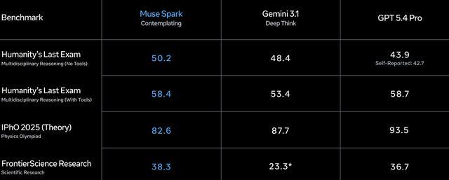 从基准测试结果来看,Muse Spark在多模态感知、推理、医疗健康和智能体等领域的表现处于行业第一梯队。不过,MSL承认这一模型在长程智能体系统和编程工作流方面性能尚有差距。
