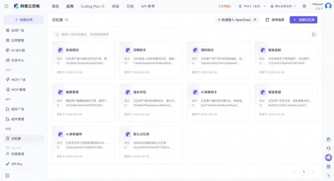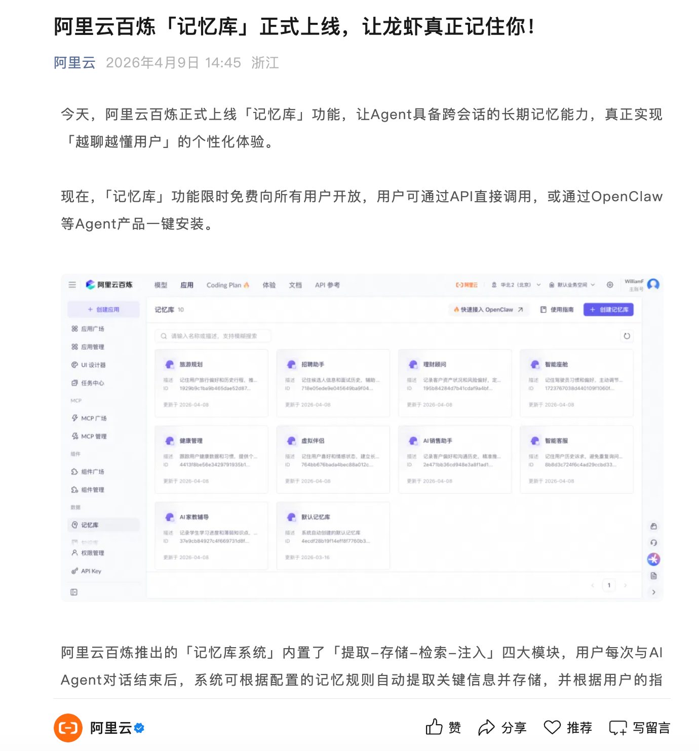 凤凰网科技讯 4月9日,阿里云百炼正式上线“记忆库”功能,让Agent具备跨会话的长期记忆能力。现在,“记忆库”功能限时免费向所有用户开放,用户可通过API直接调用,或通过OpenClaw等Agent产品一键安装。