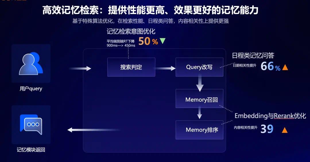 此外,阿里云百炼记忆库在检索上基于特殊算法优化,在检索性能、日程类回答以及内容相关性上提供更强的方案,实现记忆搜索判定平均RT下降50%,日期相关性提升66%,记忆内容相关性提升39%。