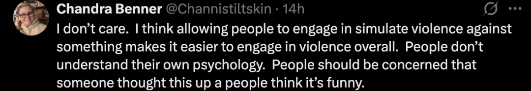 「允许人们对某事物进行模拟暴力,会使得他们在现实中实施暴力行为变得更加容易。人们往往并不了解自身的心理机制,我们应当对此感到担忧:居然有人构思出这样的内容,并且还有人认为它有趣。」