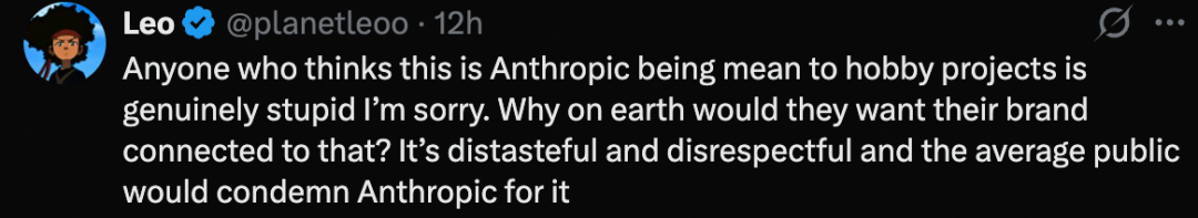 「如果有人认为 Anthropic 这样做是在刁难业余爱好项目,那真是愚蠢至极,恕我直言。Anthropic 究竟有什么理由要让自己的品牌与此类内容产生联系?」