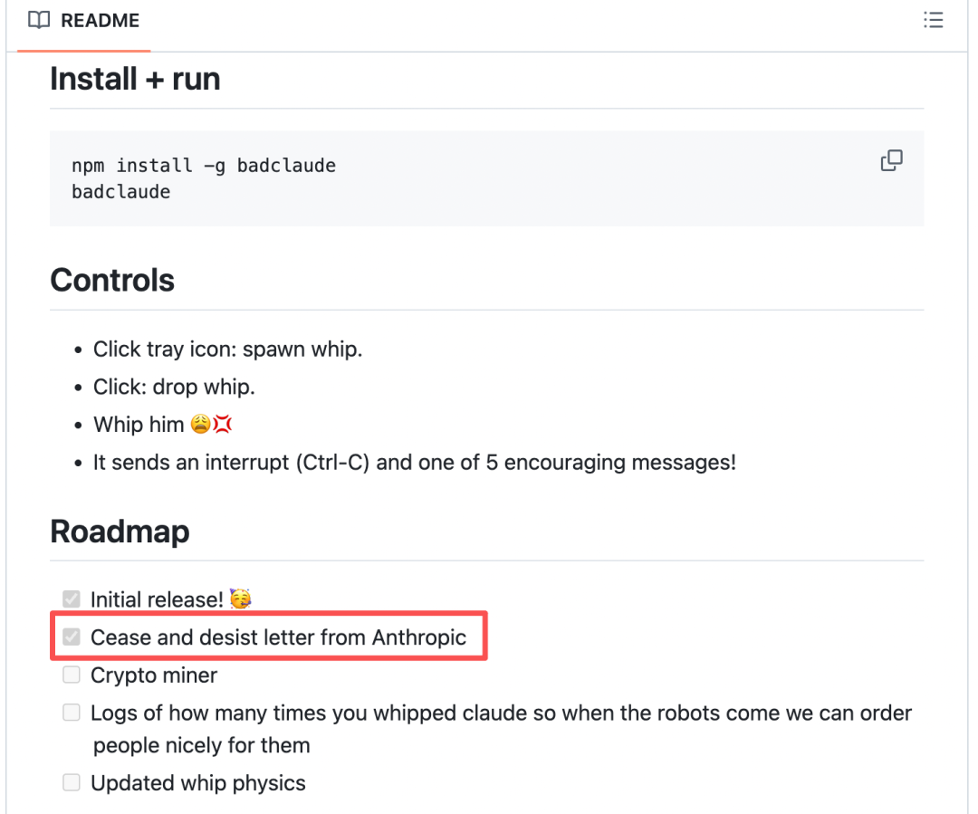 我们写信是关于您目前公开称为「badclaude」的项目。根据公开材料,该项目似乎使用了 Claude 的名称,并在与 Claude 的互动功能框架中进行营销,可能会引起关于来源、赞助、关联或背书的混淆。任何暗示该项目与 Anthropic 有关系、经过 Anthropic 批准或与 Anthropic 关联的情况,都可能会误导公众。