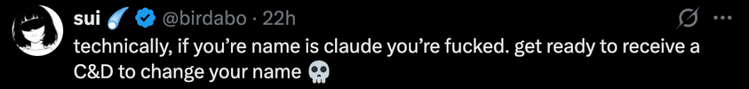 「严格来说,如果你的名字叫 Claude,你就完蛋了。准备好收到一份要求你改名的停止侵权通知函吧。」