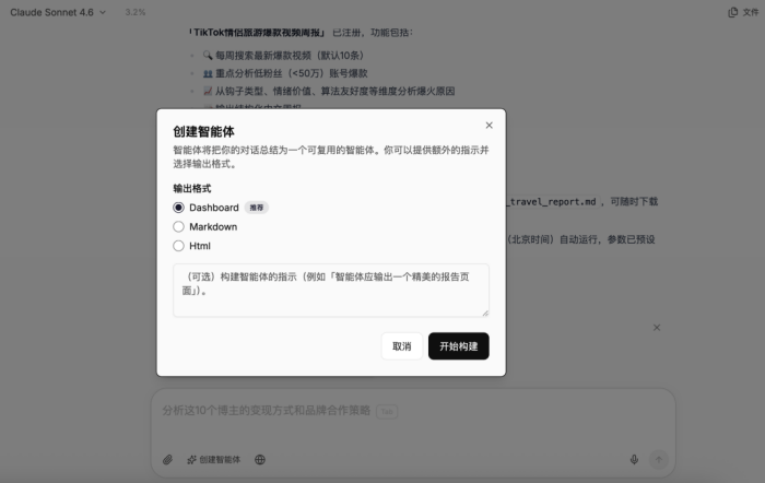 按照指令,CREAO的AI系统帮你把流程搭好,并且成功跑通后,你如果对最终效果满意,可以点击“创建智能体”按钮,把这一套完整的工作流程“固化”成一个能永久使用的Agent。