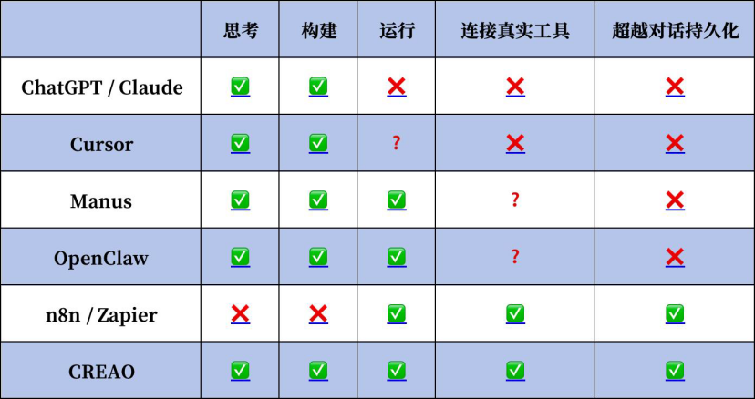 在思考、构建、运行、连接真实工具、超越对话持久化这五个核心维度上,唯有CREAO在五个维度上全部实现,成为六款产品中唯一全能型选手。