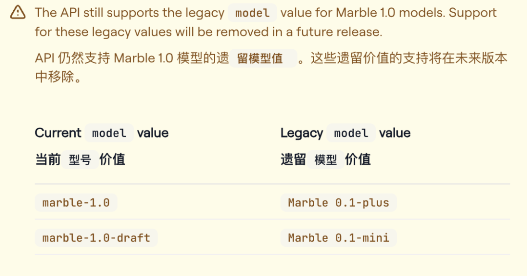 另外,此前的Marble-0.1-plus、Marble-0.1-mini等旧命名后续会逐步移除,并统一映射到1.0系列: