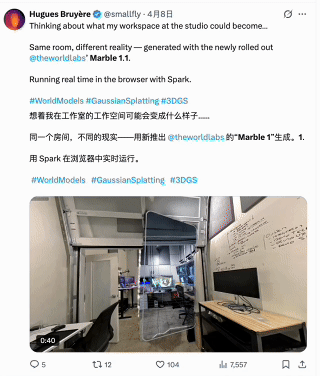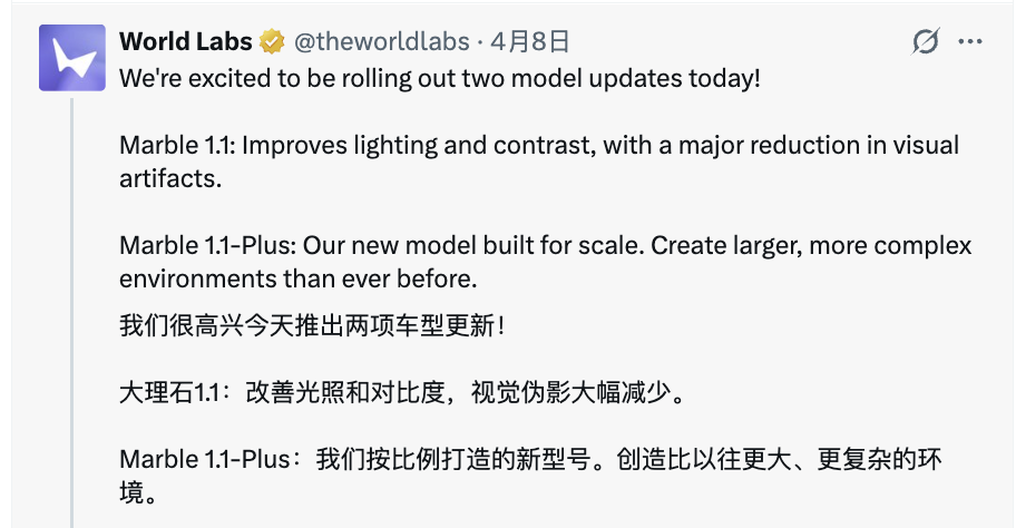 Marble 1.1让输出画质质量更强,Marble 1.1-Plus让空间覆盖范围更广,也算是对技术路线又一次比较具体的落地展现了。