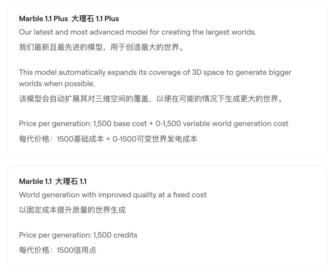 官方定价页面显示,Marble 1.1的生成消耗均为1,500积分,和上一代价格保持一致。