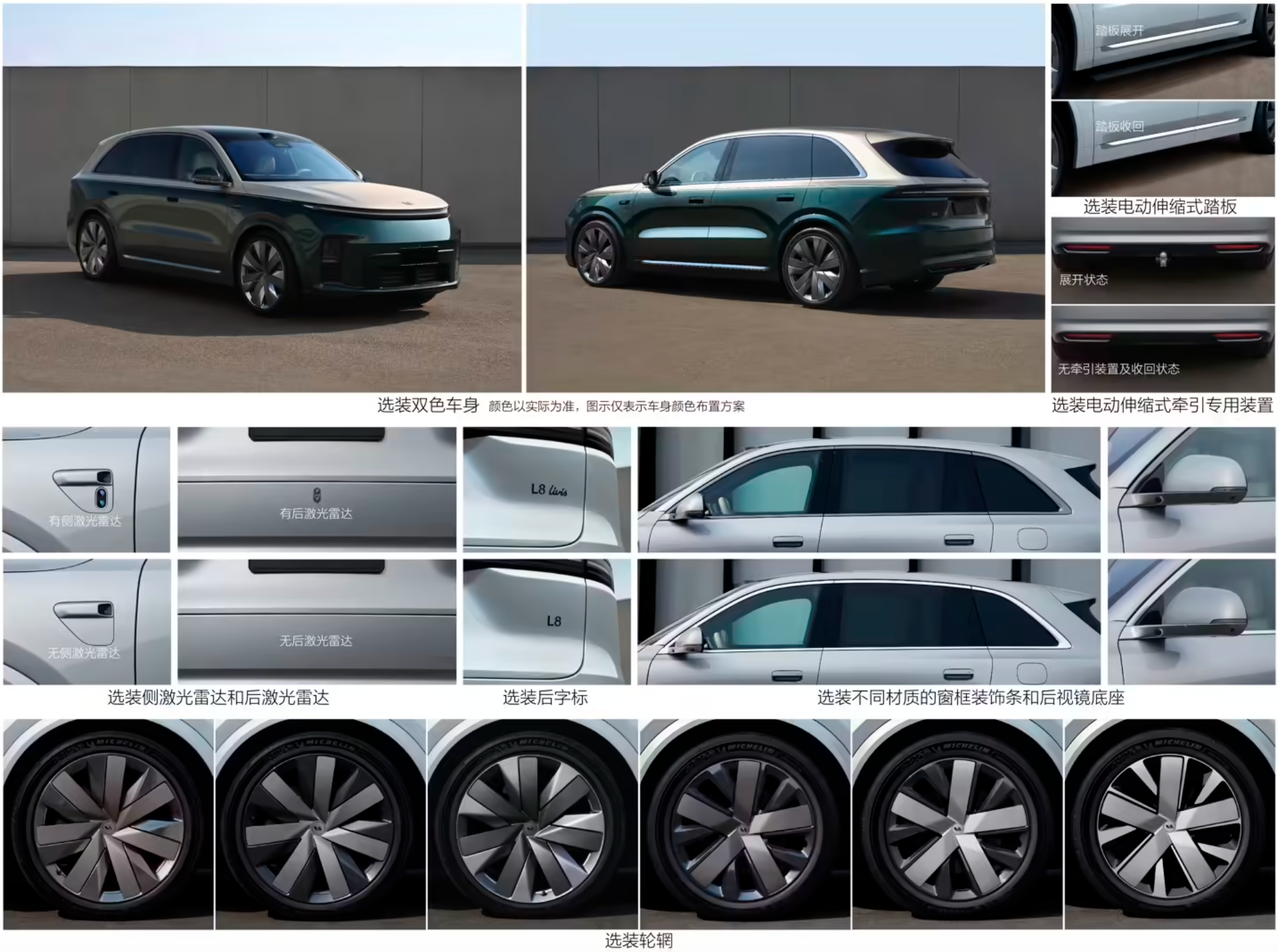 理想L8 Livis可选装轮辋、电动伸缩式踏板、电动伸缩式牵引专用装置、不同材质窗框装饰条/后视镜底座、侧激光雷达/后激光雷达、后字标、双色车身。