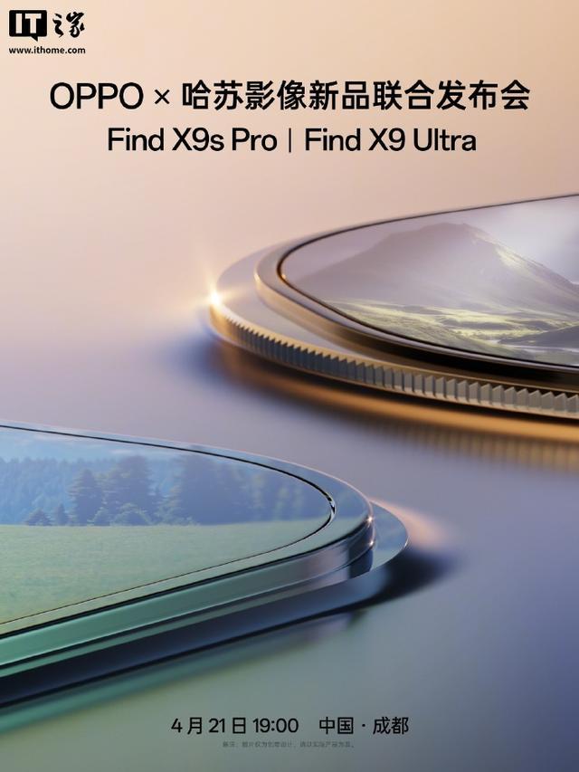 IT之家 4 月 10 日消息,OPPO × 哈苏影像新品联合发布会将于 4 月 21 日晚 19:00在成都举办,届时将带来 Find X9s Pro 和 Find X9 Ultra 两款旗舰新机。