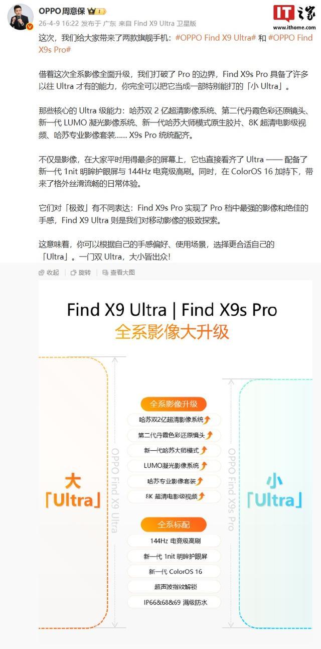 OPPO Find 系列产品负责人周意保昨日发文,透露了 Find X9s Pro 和 Find X9 Ultra 两款新机的更多信息。他表示,借着这次全系影像全面升级,OPPO 打破了 Pro 的边界,Find X9s Pro 具备了许多以往 Ultra 才有的能力,完全可以当成一部特别能打的「小 Ultra」。