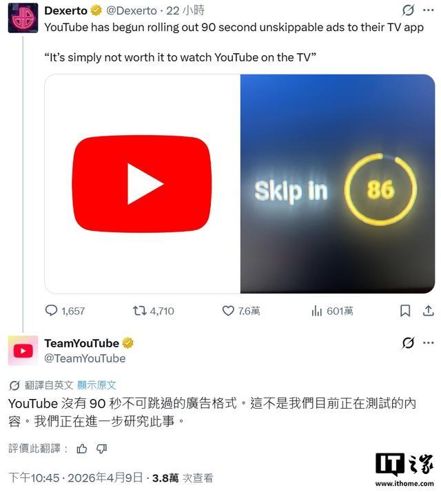 IT之家 4 月 10 日消息,YouTube 团队昨天在 X 平台发文,回应平台出现“90 秒不可跳过广告”一事。