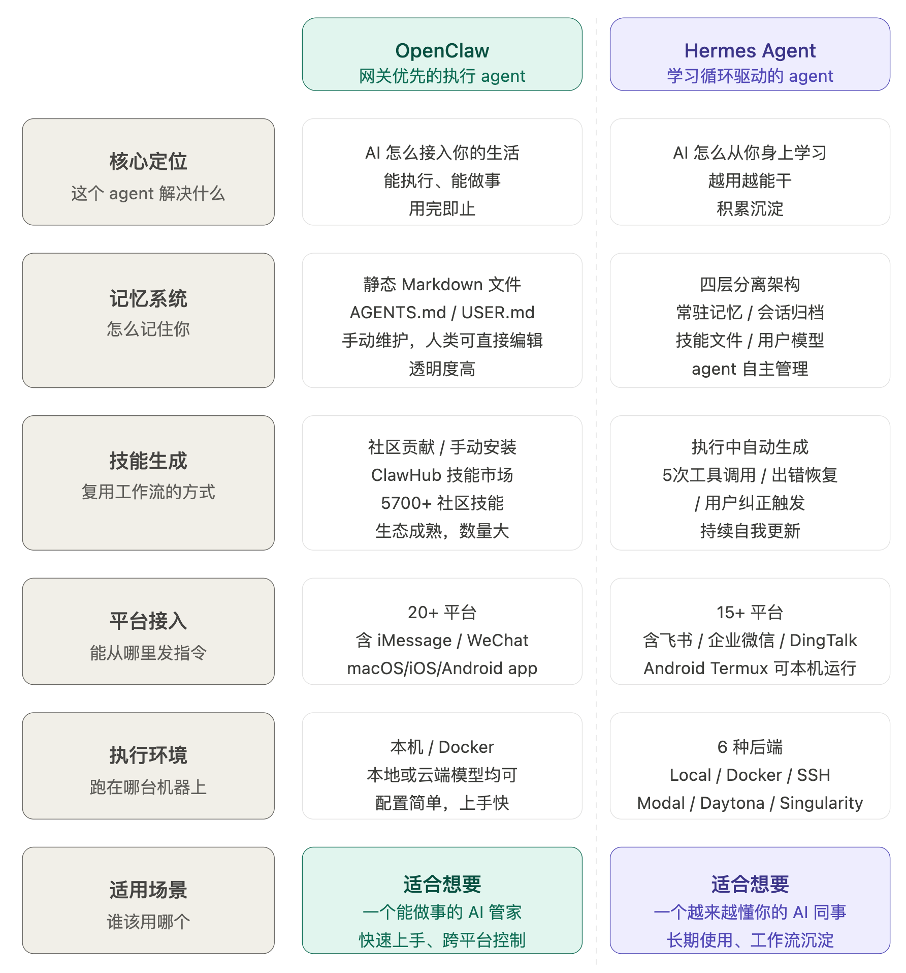 虽然现在有一些专门的 Skill 被设计用来赋予 OpenClaw 自学习的能力,但是、 Hermes Agent 是从底层架构的学习循环,到记忆系统,和 Agent 执行内部,都把「越用越懂你」作为重点。