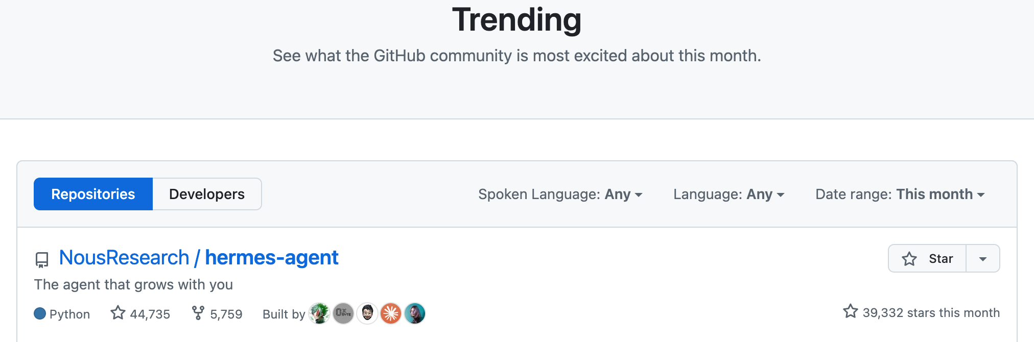 本以为是谐音梗,没想到确实有一个 Agent 产品叫 Hermes,而且在 GitHub 的热门榜单上,整个月都排名第一,目前已经累计有 4.8 万个 Stars。