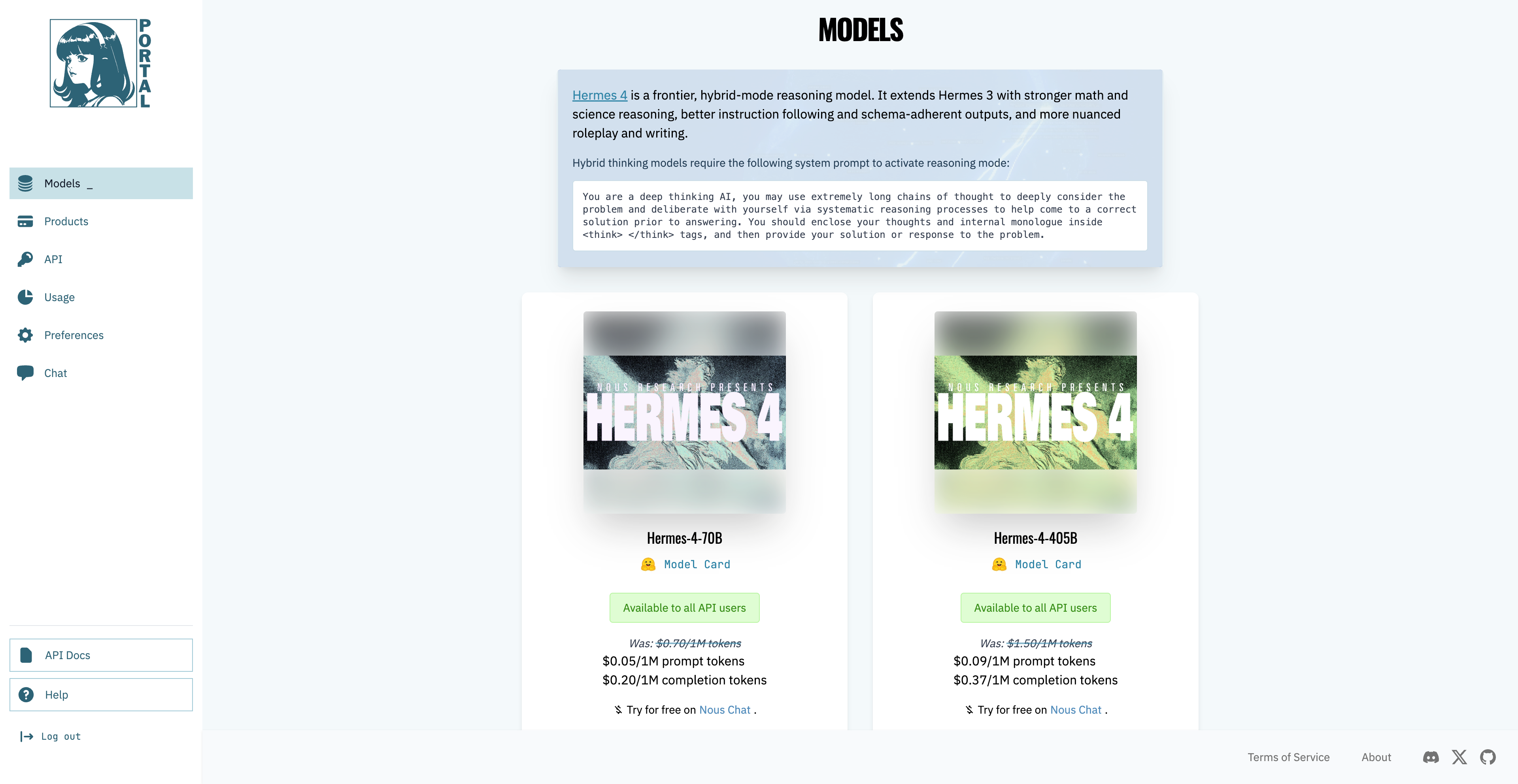 还有小米的 Xiaomi MiMo-V2 系列,包括支持百万上下文 Token 的 MiMo-V2-Pro、全模态的理解能力的 MiMo-V2-Omni,以及 Flash 模型。小米还提供了 4.8-4.22 为期两周的限免试用,更新 Hermes Agent 到最新版本,通过 Nous Portal 秒飞调用小米大模型。