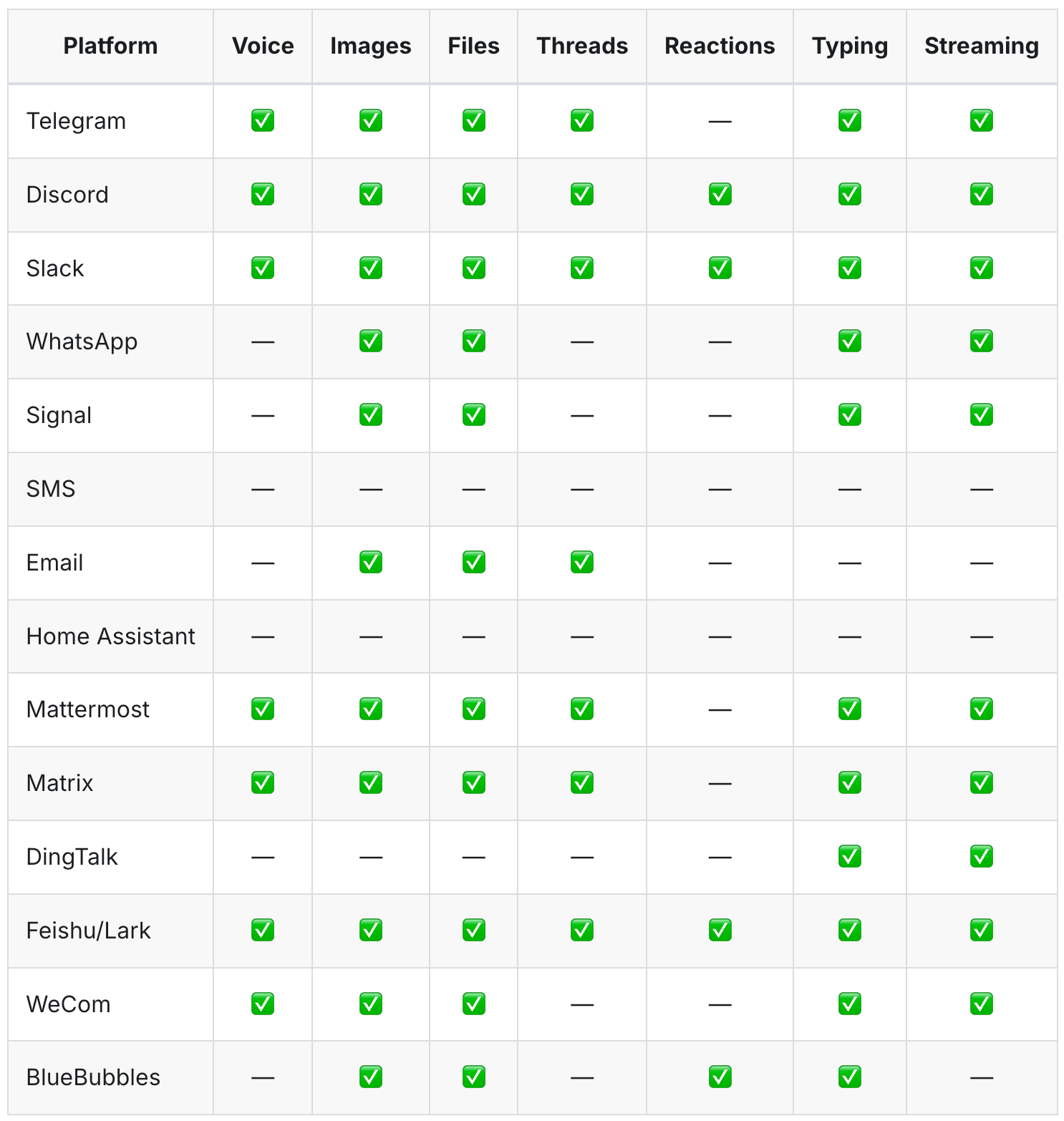 消息平台方面,支持列表和 Openclaw 类似,Telegram、Discord、Slack 和飞书是功能最完整的几个,语音、图片、文件等各种格式都支持。一套网关进程连接所有平台,会话统一管理。
