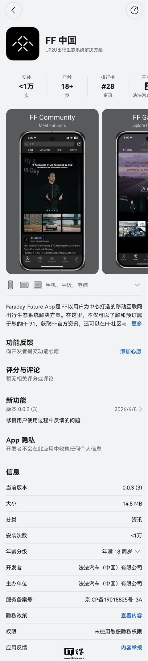 IT之家 4 月 10 日消息,法拉第未来旗下“FF 中国”现已正式登陆华为应用市场,版本号为 0.0.3(3),包体积 14.8 MB,分类为“资讯”App。