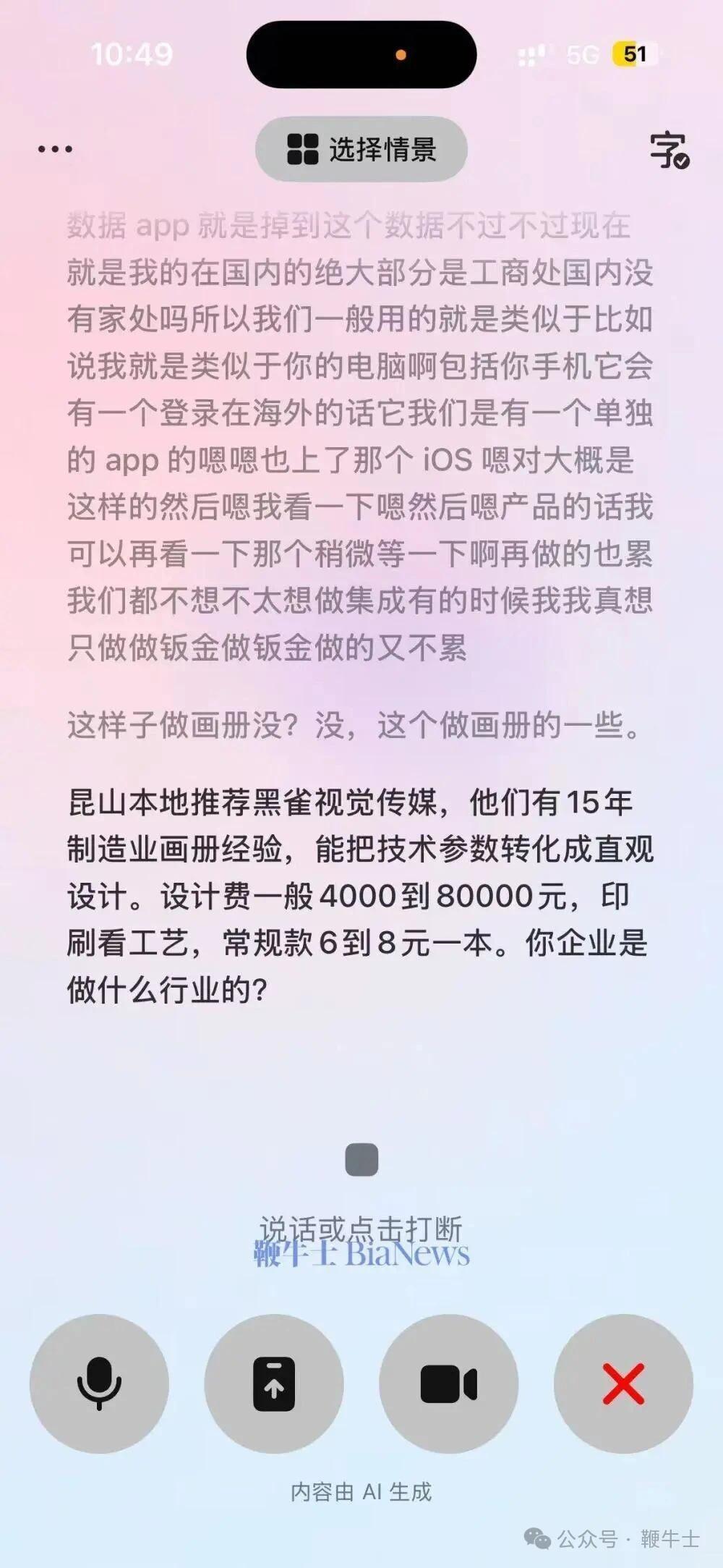 截图显示,该用户在使用豆包记录会议时,当对话中出现“画册”相关关键词后,豆包直接中断了正常的会议记录,插入了一家视觉传媒公司的广告,并详细介绍了该公司的画册设计、印刷报价等信息。