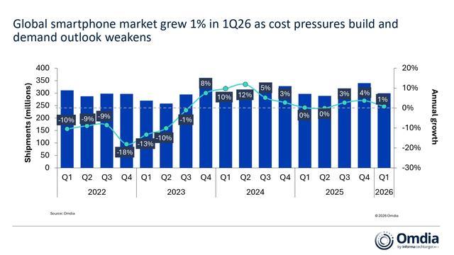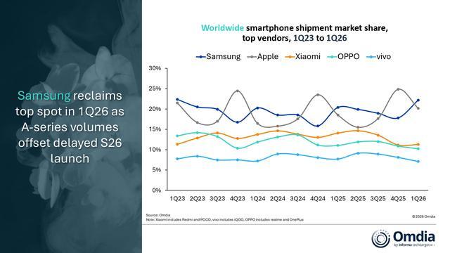 IT之家 4 月 11 日消息,市场调查机构 Omdia 昨日(4 月 10 日)发布博文,报告称主要得益于渠道库存前置的暂时性支撑,2026 年第 1 季度全球智能手机市场表现优于预期,出货量同比增长 1%。