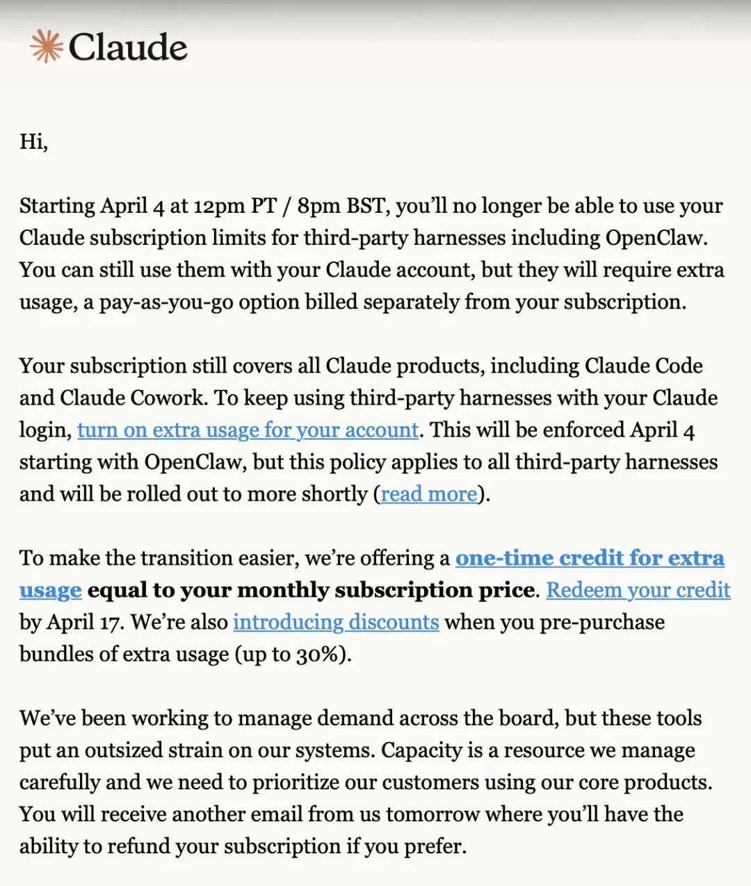 就在封号风波的前几天,很多 OpenClaw 用户悄悄收到了一封邮件:从太平洋时间 4 月 4 日起,Claude 订阅额度不再覆盖 OpenClaw 在内的第三方工具。