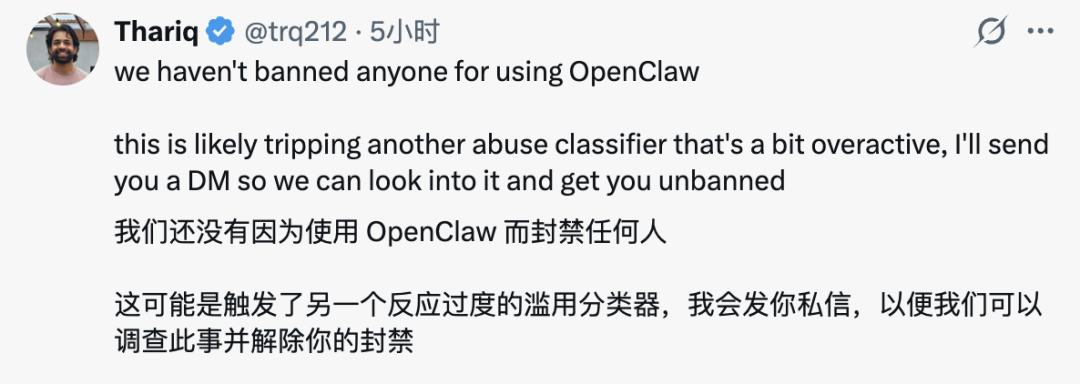 「我们没有因为任何人使用 OpenClaw 而封号。这很可能是另一个有点过于敏感的滥用检测分类器误判了。我会私信你,看看能不能查清楚并帮你解封。」