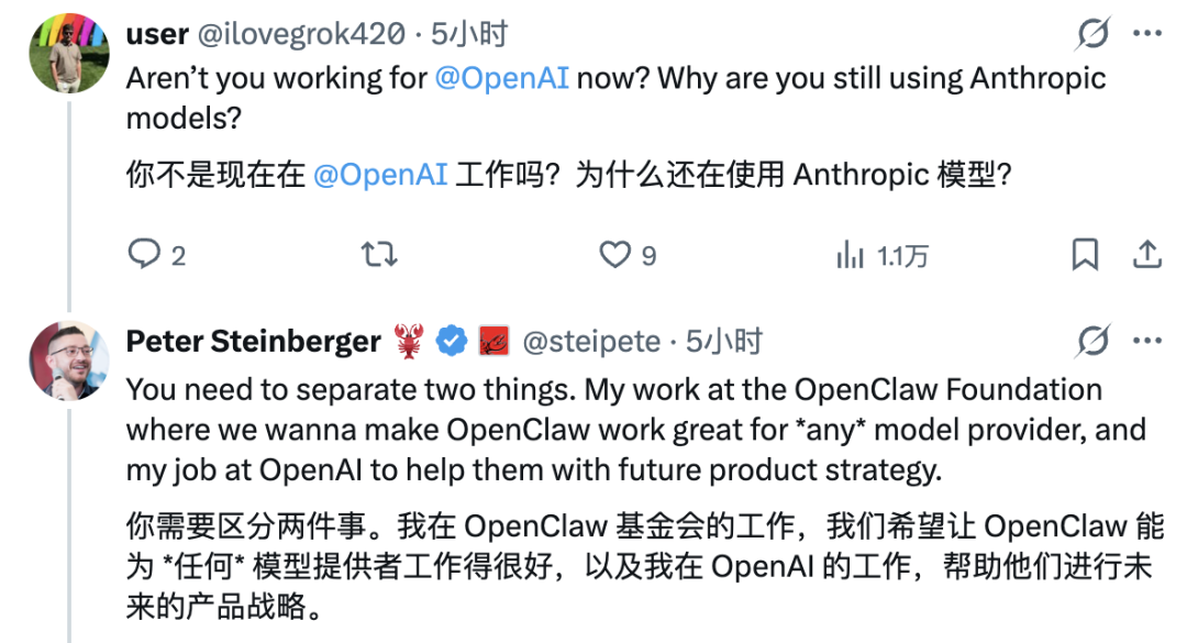 他在 OpenClaw Foundation 的工作,目标是让 OpenClaw 兼容所有模型供应商;在 OpenAI 的工作,是帮助产品战略。用 Anthropic,只是因为要做端到端测试,确保 OpenClaw 的每次更新不会跟主流模型出问题。