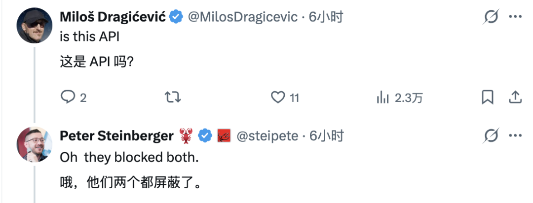 推文传开后,引发了轩然大波,评论区里有网友问 Steinberger,被封的是 API 还是别的什么。他的回答是:「两个都封了。」,这意味着他连日常的兼容性测试都跑不了了。