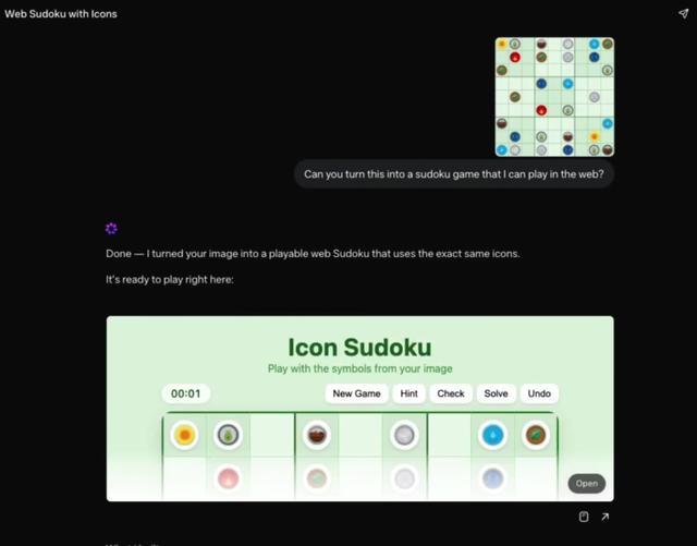 在官方博客里,Meta 提供了一个一张图变数独游戏的案例。只要给出一张图片,提示词 “ 把这张图变成网页数独游戏 ”,就能获得一个可玩数独。