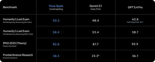 而在即将推出的 “ 沉思模式 ” 下,Muse Spark 在一些高难测试集,如 Humanity’s Last Exam 里的思考推理表现,也和 Gemini 3.1 Deep Think,GPT 5.4 Pro 差不多。