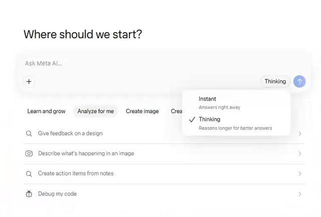 目前 Muse Spark 只开放了 Instant 和 Thinking 两种模式,前者快速回答,后者有一些思考和推理能力,我们这回主要测能力更强的 Thinking。