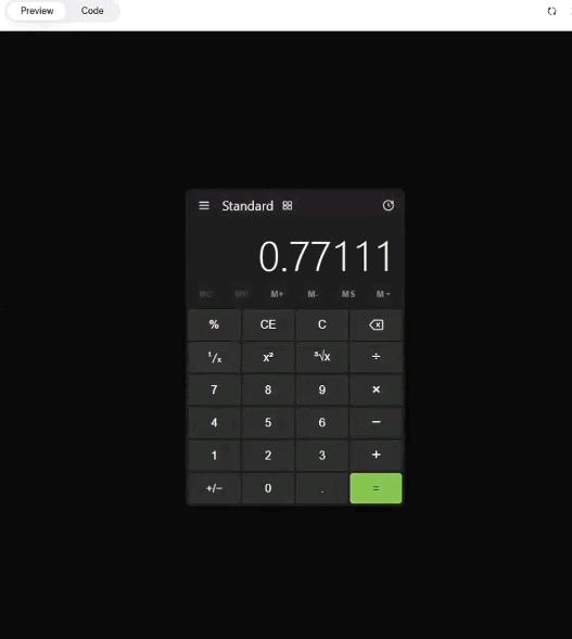 下面这个例子就更猛了。世超只是随手截了一个 win11 系统计算器图给它,提示 “ 把这张图片变成一个可用计算器 ”,Muse Spark 一口气做出来的 demo,每个按键都好使,计算准确,界面和系统妈生计算器一模一样。