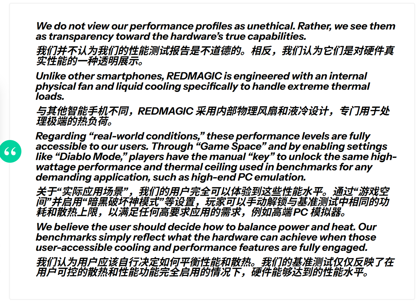 努比亚强调,用户可通过“游戏空间”(Game Space)启用“暗黑模式”(Diablo Mode),手动解锁与基准测试相同的高功耗性能,用于高负载场景如 PC 模拟器,因此测试结果反映了用户可达到的极限状态。