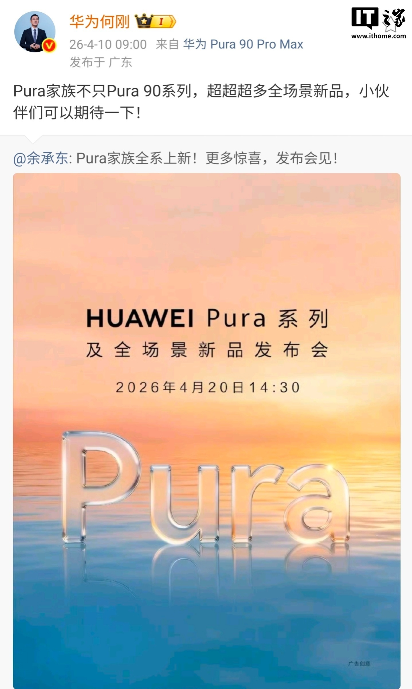 IT之家注意到,华为 Pura 系列及全场景新品发布会昨日官宣定档 4 月 20 日 14:30。据华为终端 BG 首席执行官何刚透露,Pura 家族不只 Pura 90 系列,超多全场景新品可以期待一下。从何刚的发言不难看出,华为 Pura 家族有望带来更多惊喜。