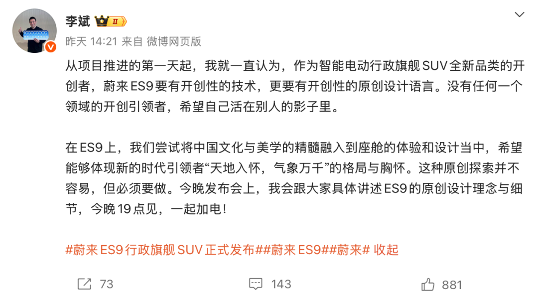 在昨晚蔚来 ES9 发布前的几小时,李斌似乎有些按捺不住内心的波澜,他在微博上写下了这样一段话: