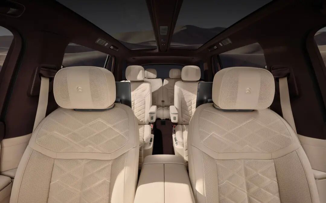 在座舱的空间布局上,ES9 提出了「天地入怀,气象万千」的理念,创新性地引入「天空岛」和「智能行政中岛」这两个概念,来化解车内开阔感与专属感之间的矛盾。