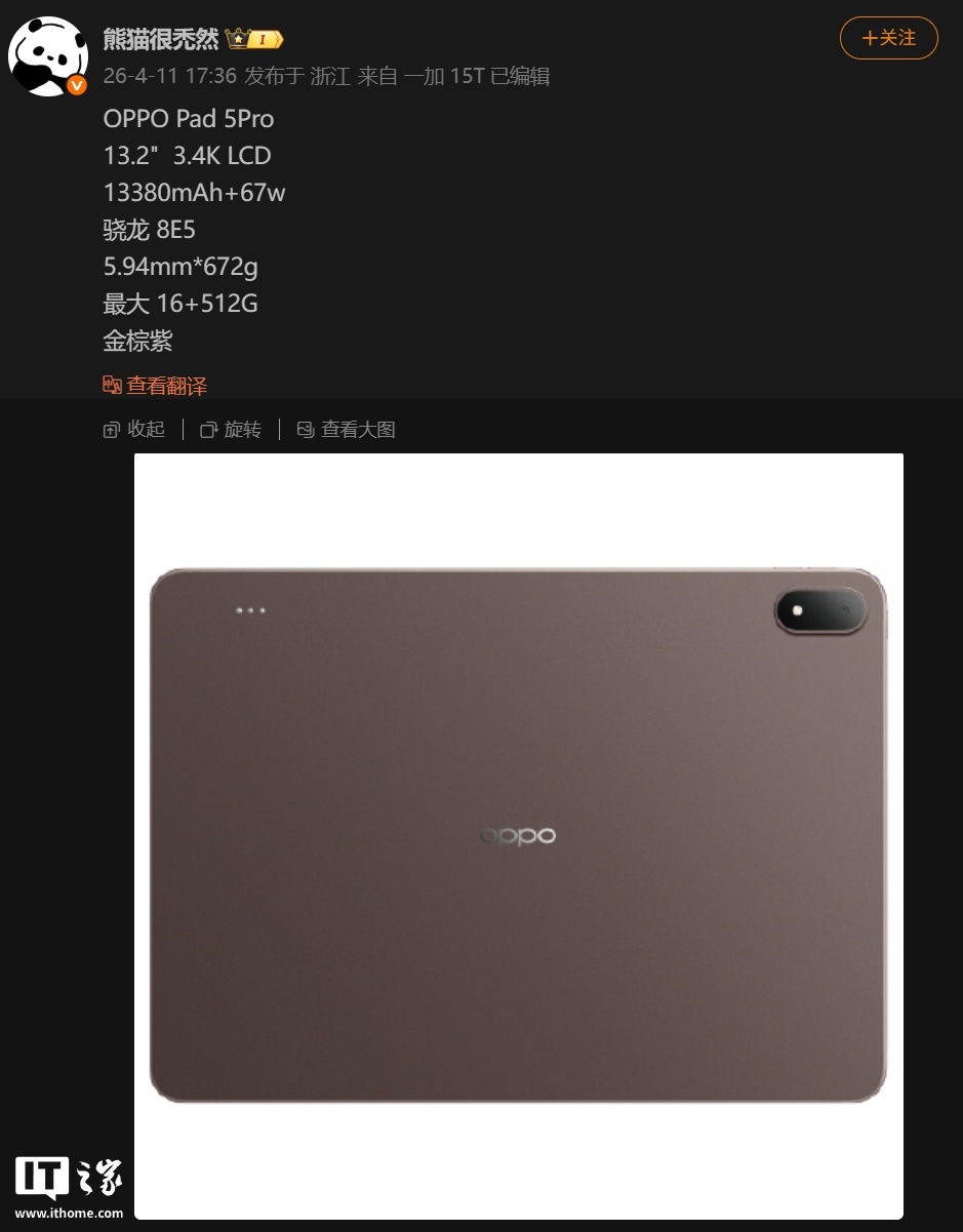 IT之家 4 月 11 日消息,博主 @熊猫很禿然 今日在微博发文,曝光 OPPO Pad 5Pro 平板的详细参数。