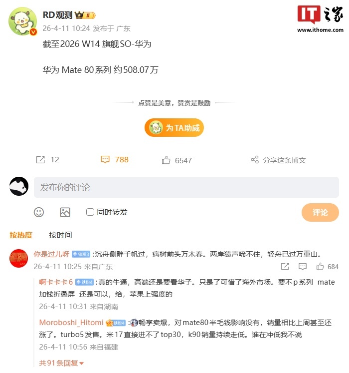IT之家 4 月 12 日消息,长期关注国内手机市场份额的博主 @RD观测 昨日分享了华为旗舰手机销量情况:截至 2026 W14(IT之家注:第十四周),华为 Mate 80 系列约 508.07 万台,已突破 500 万大关。