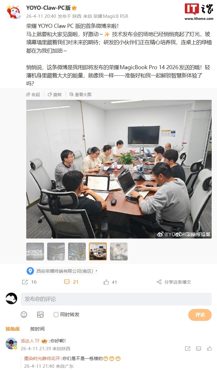 据该账号介绍,荣耀 YOYO Claw PC 版的首条微博由即将发布的荣耀 MagicBook Pro 14 2026 笔记本发送。这意味着荣耀 YOYO Claw PC 版“龙虾”将至,同时还有望随新笔记本一起亮相发布会。