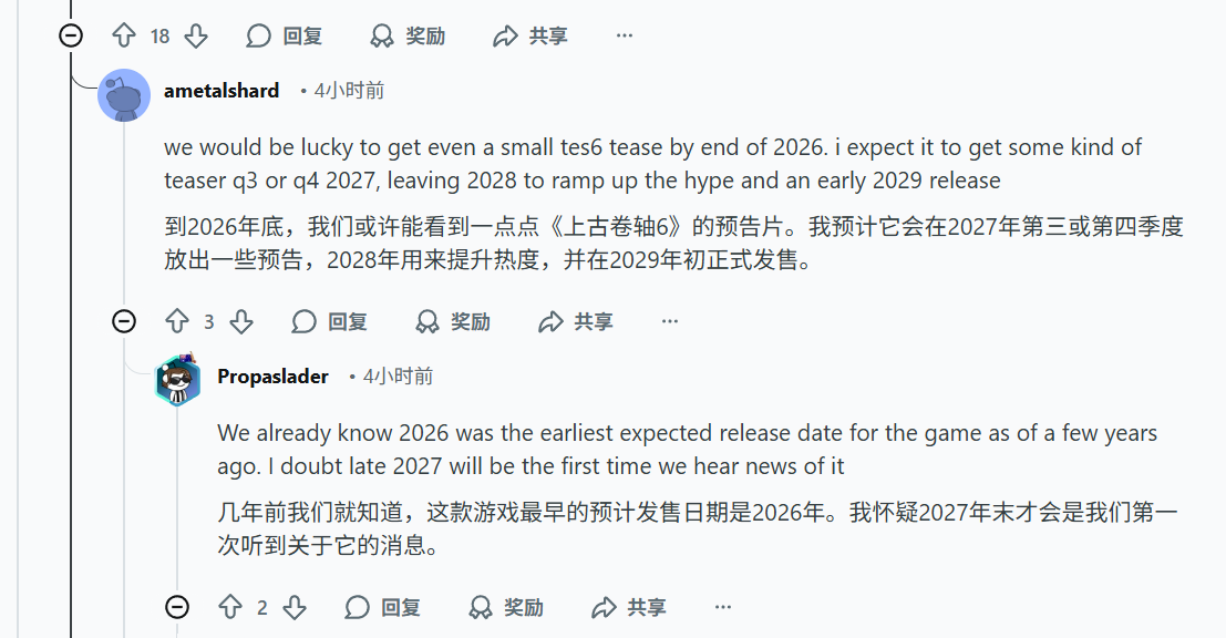 不过也有用户认为,B 社最早要到今年年底才会公开《上古卷轴 6》预告片,之后则是慢慢放出零星消息,2029 年才会正式发售。