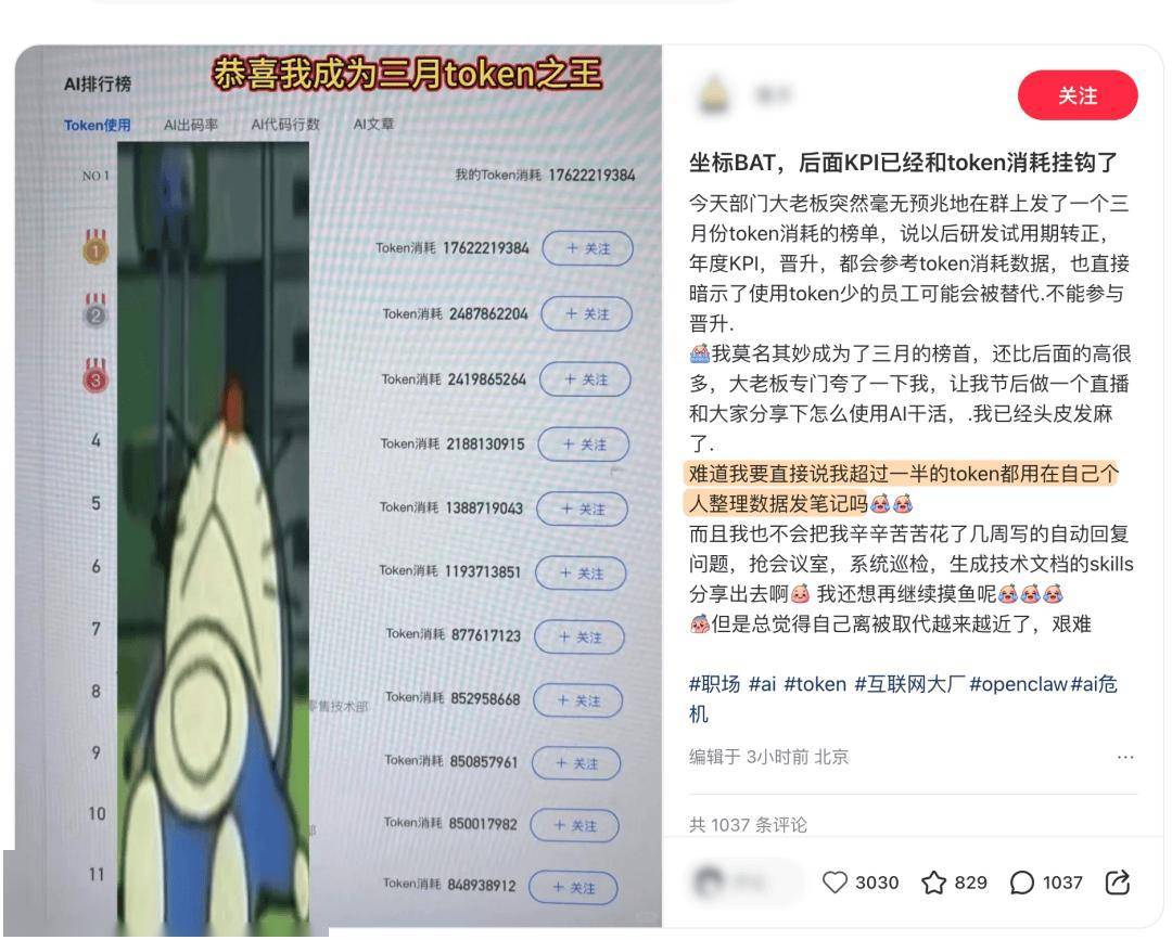 一个自称在 BAT 大厂(首先 B 排除百度)的网友说:部门突然开始搞 token 消耗排行榜,以后试用期转正、年度KPI、晋升,都要参考这个数据,甚至用得少的人,可能被替代。
