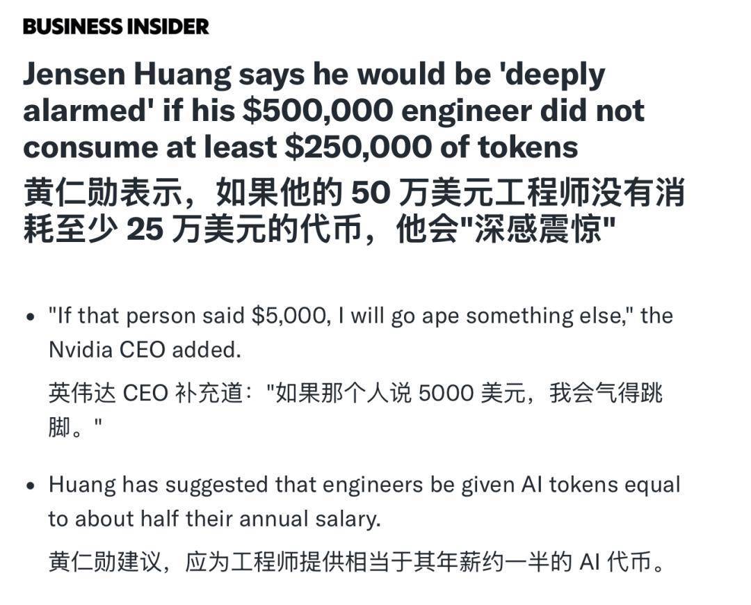 假设有一个年薪 50 万美元的工程师,年底你问他今年花了多少 token,如果没花到 25 万美元,老黄说会“ deeply alarmed ”,深感震惊。