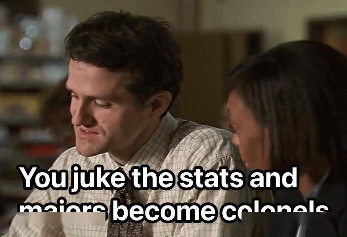 剧里有句台词:You juke the stats and majors become colonels. 刷刷数据,少校能升上校。