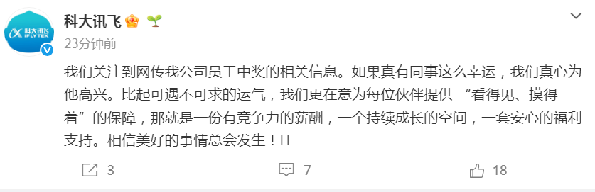凤凰网科技讯 4月13日,“员工中了1500万彩票后直接离职”话题登上热搜,引发网友热议。对此,科大讯飞回应称,我们关注到网传我公司员工中奖的相关信息。如果真有同事这么幸运,我们真心为他高兴。比起可遇不可求的运气,我们更在意为每位伙伴提供 “看得见、摸得着”的保障,那就是一份有竞争力的薪酬,一个持续成长的空间,一套安心的福利支持。相信美好的事情总会发生。
