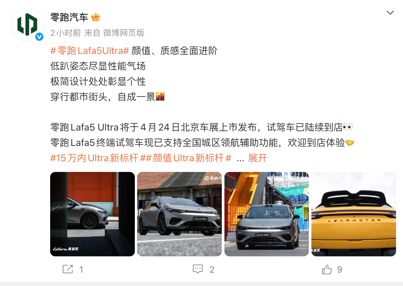 凤凰网科技讯 4月13日,零跑汽车宣布零跑Lafa5 Ultra将于4月24日北京车展上市。该车支持全国城区领航辅助功能,目前展车正陆续运抵各地门店。